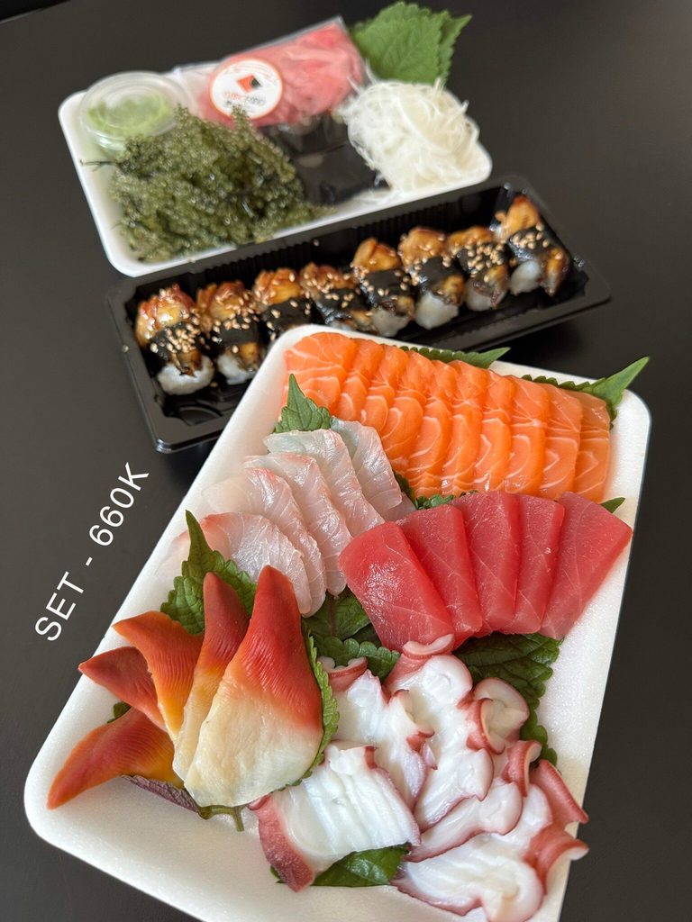 Set 660 ( 1 sushi lươn Nhật, 100g hồi, 5 chẽm, 5 ngừ, 5 tuộc, 5 sò đỏ)